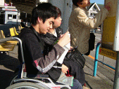 自立生活支援センターのみなさんへ 先日、お世話になった本保です。 この実習でたくさんいろいろなことを知 ることができました。 本当にありがとうございました。 その中で一番勉強になったのはバスの直 通、のりかえ各停の意味を知ったことで した。 今後の生活の中で、「少しずつのってみ る」という気持ちが出てきました。 ピアカウンセリングでも、貴重な話をた くさん聞かせていただき、ありがとうご ざいました。 バスに乗って出かけてみよう! 一日目は、コミニュティバスに乗って富山 駅前に出かけました。 行き先は、駅前のバス停とカラオケがメイ ン。カラオケでは熱唱!。 富山駅前バス停では、今まで疑問に感じ ていたことを質問したり、説明を受けたり、 いろいろと聞きました。 二日目は、お好み焼きを作りました。近 くのスーパーで材料を買って、自立生活 体験室で作りました。 午後からは、ピア・カウンセリングを行 い、いろいろなことについて話しました。 |