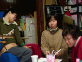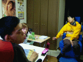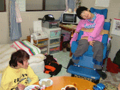 ![]() ![]() ![]() | 平井さん 浅木さん 松谷さん 本当にお世話になりました。 ありがとうございました。 訪問した三人の人たちによろしくお伝え 下さい。 鍋がとってもおいしかったです。 また、皆さんといっしょに鍋パーティを したいです。 一人暮らしの障害者を訪ねて 一日目は、もう一人暮らしをして長い福田 さん宅で、こまどり養護を卒業された。 彼女の体験をいろいろと話してもらった。 二日目は、10月に施設から出て一人暮ら しをはじめたばかりの竹腰さん。テレビ で一人暮らしをしている障害者を見て、 「僕もしたい」と思ってそれを実現した という。 三日目は、施設から出たばかりの大野さ ん。言語によるコミュニケーションは無 理で、横川さんと似ている人だ。一番話 があってアニメのことで盛り上がった。 四日目は、料理で「鍋」を作った。鍋に は鮭を入れた。横川さんは、スマップの 草彅くんのファンで、その人がコマーシ ャルしているポン酢を買ってきておいし く食べました。 (上の鍋の写真はその時のものです。) |